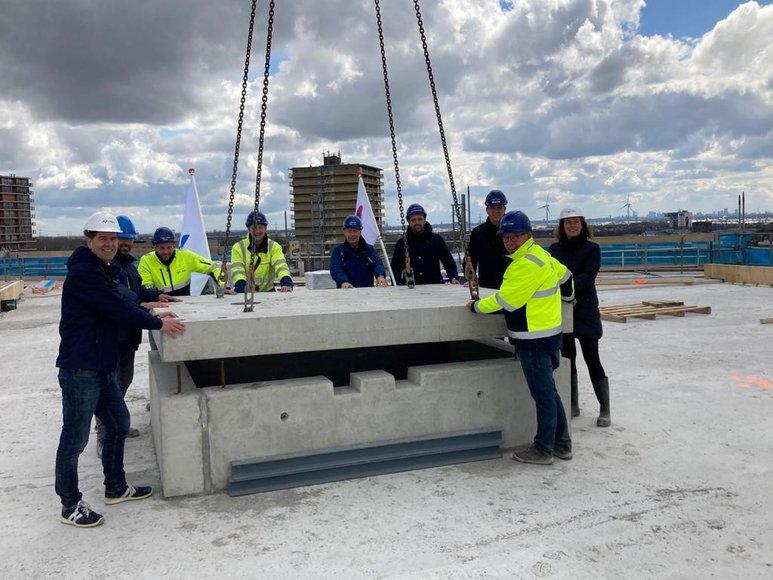 ZOETERMEER – Het hoogste punt van het nieuwe duurzame woon- en winkelcentrum Stadskwartier Palenstein is bereikt. Aan de Jan van Beierenlaan bouwt De Goede Woning in totaal 109 sociale huurwoningen, 42 middenhuur woningen, twee supermarkten en een aantal kleinere winkels. Stadskwartier Palenstein bestaat uit 6 gebouwen: Markies, Barones, Gravin, Koningin, Hertog en Ridder. Sinds donderdag 15 april wappert ook op het dak van het hoogste gebouw (Koningin) een vlag.